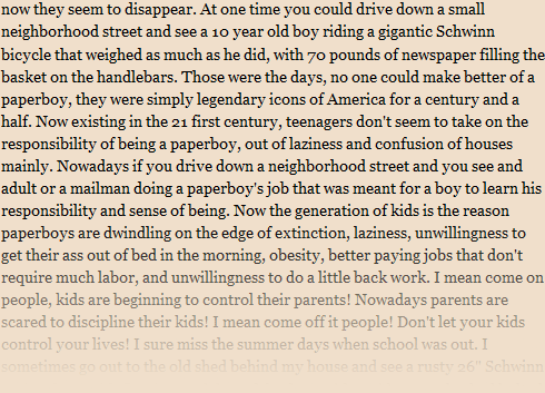 The reason you don't see paperboys anymore has nothing to do with kids and their willingness to work, and everything to do with the newspaper delivery business and how it is run. Newspapers want no part of child workers anymore. But don't let me stop your misinformed rant...