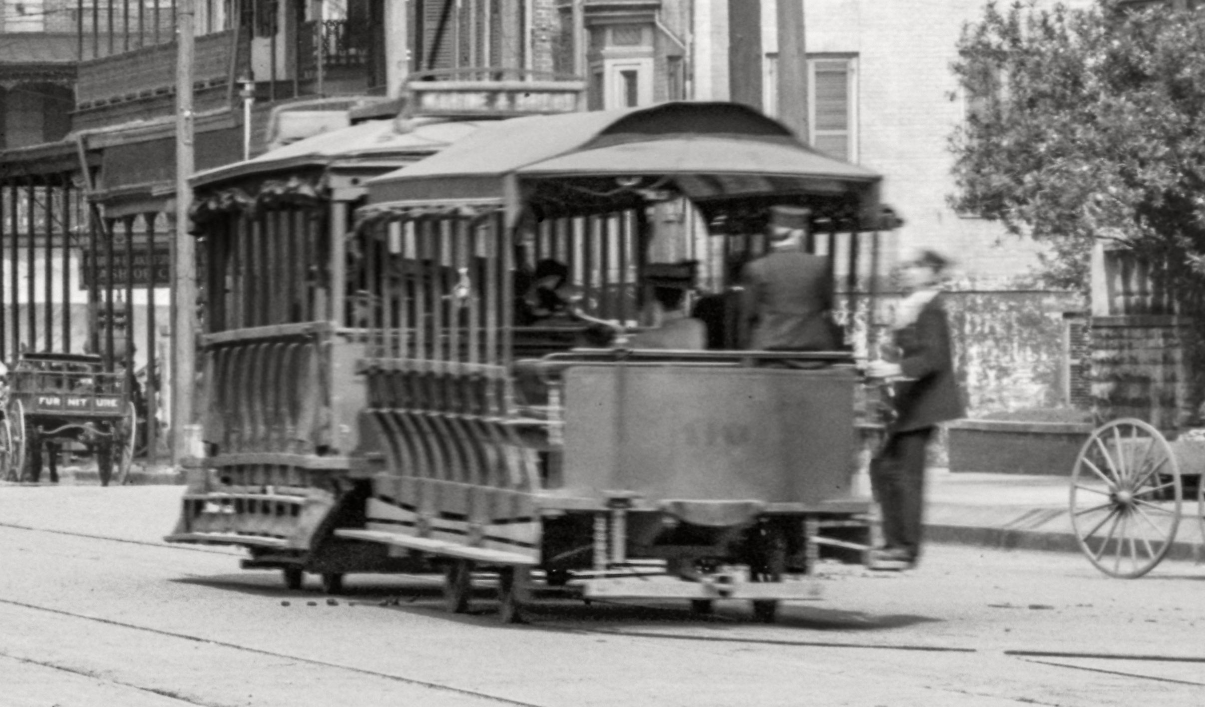 Note the electric streetcar. Its trailer is almost certainly a former horse-drawn (or mule-drawn) streetcar, rendered obsolete by the coming of the electric cars, but still serviceable as a trailer car. This was fairly common practice in the 1890s but was somewhat rare by the time this photo was made.